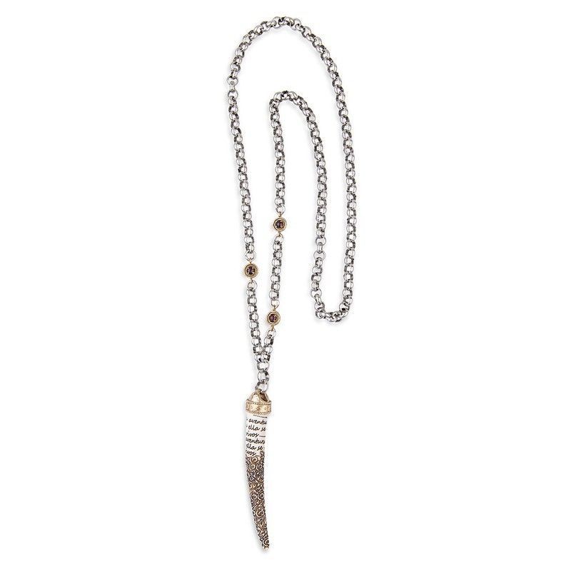 Collar unisex chapado en plata de ley con colgante en forma de colmillo labrado, ideal para quienes buscan un toque distintivo y sofisticado. Cadena larga con eslabones metálicos y detalles dorados que aportan elegancia. Perfecto para combinar con looks casuales o formales, destacando por su diseño atemporal y acabado de calidad.