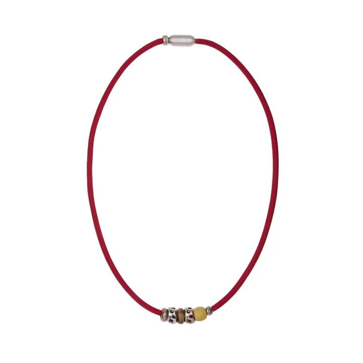 Collar/pulsera multifuncional con cuerda de nylon rojoCierre magnético plateadoTres cuentas decorativas: dos metálicas y una de color amarilloDiseño minimalista y versátil