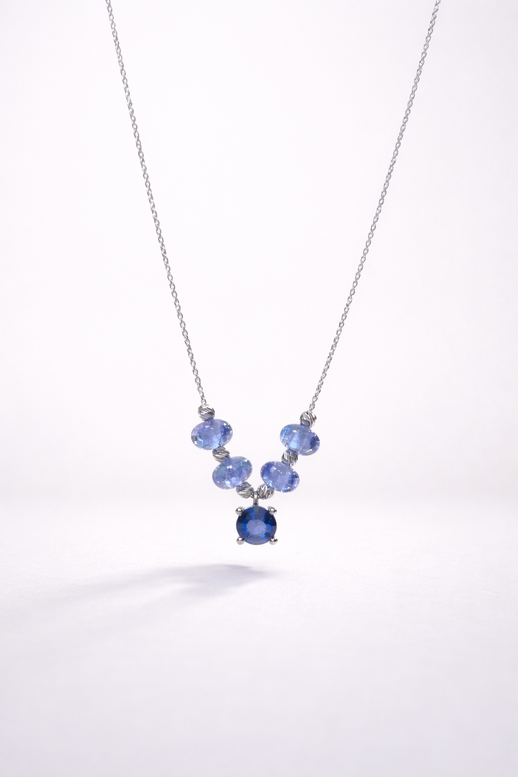 Collar SATERRA de oro blanco con zafiros azules, diseño elegante en forma de V con cinco piedras preciosas de tonos azules variados. Ideal para mujeres que buscan joyería sofisticada y única. Perfecto para ocasiones especiales o como pieza de lujo diaria. Calidad superior, acabado pulido y cadena fina para un look refinado.
