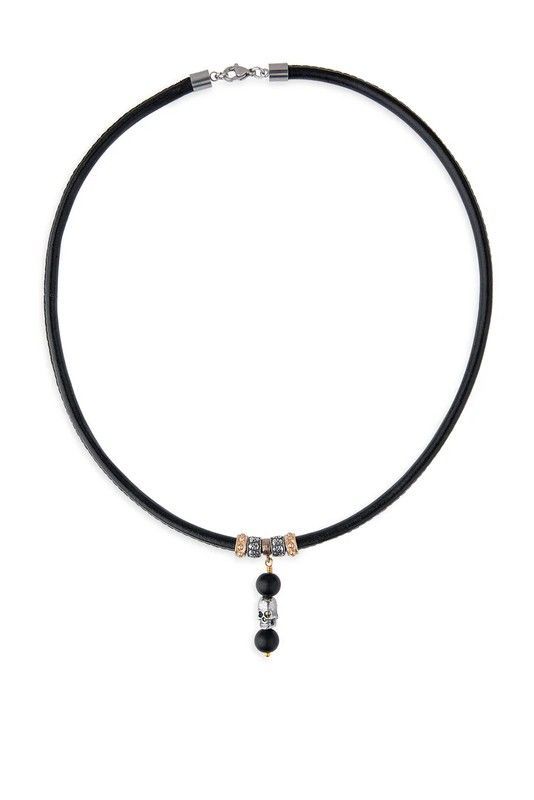 Collar Sekkim SN044X con colgante de calavera en plata de ley, ideal para adultos que buscan un estilo urbano y sofisticado. Fabricado con cuerda de cuero negro y detalles metálicos plateados y dorados, incluye piedras negras que resaltan su diseño. Perfecto para combinar con looks casuales o formales, añadiendo un toque distintivo y atrevido a tu
