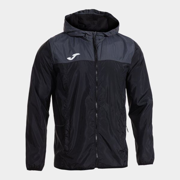 Chaqueta deportiva Combi Raincoat en negro y gris oscuro, ideal para entrenamientos al aire libre. Fabricada en poliéster resistente al agua, con capucha y cierre completo. Diseño colorblock con detalles en contraste y logo de la marca. Perfecta para deportistas que buscan protección y estilo en condiciones lluviosas.
