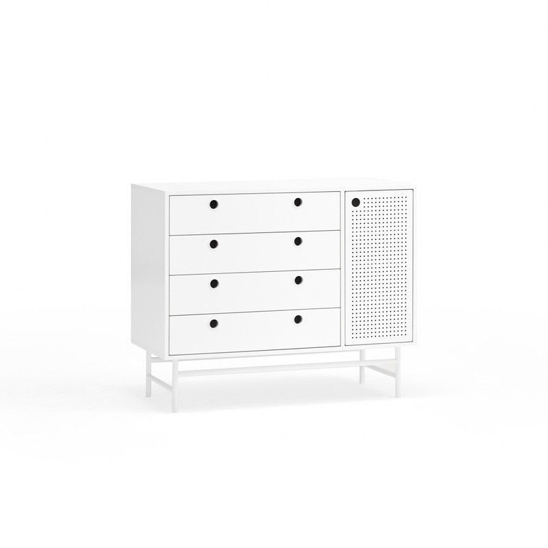 Cómoda de madera y metal en blanco, ideal para espacios modernos y minimalistas. Con 4 cajones y una puerta perforada con diseño de puntos, combina funcionalidad y estilo. Estructura metálica robusta y acabado pulido. Perfecta para dormitorios, salas o entradas. Dimensiones: 97 x 45 x 80 cm.