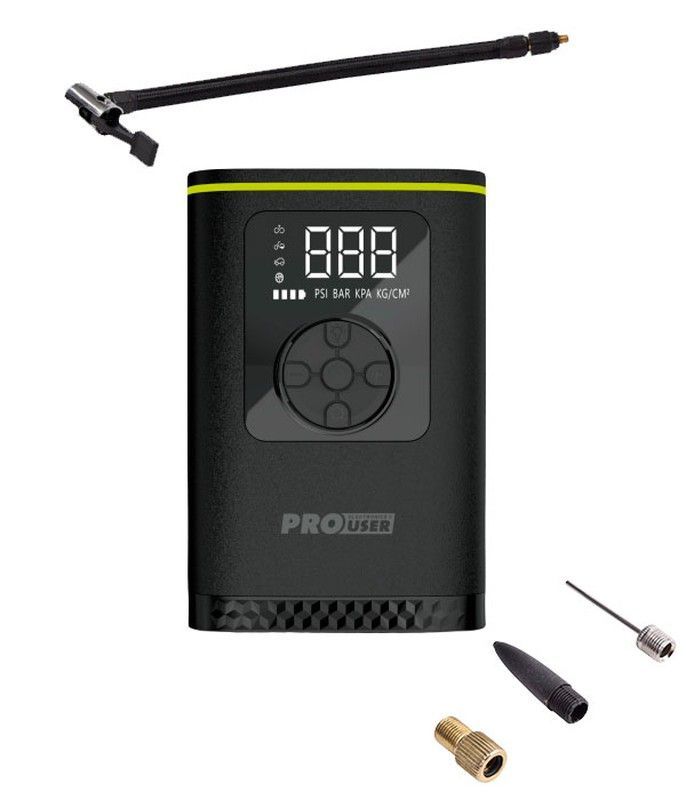 Compresor de aire portátil Pro-User AC2200, ideal para inflar neumáticos de coche, bicicleta o inflables. Con pantalla digital LED que muestra la presión en múltiples unidades (PSI, BAR, KPA, KG/CM²) y botón multifunción. Incluye accesorios para diferentes usos. Fabricado en plástico y metal, resistente y compacto. Perfecto para viajes, emergencias