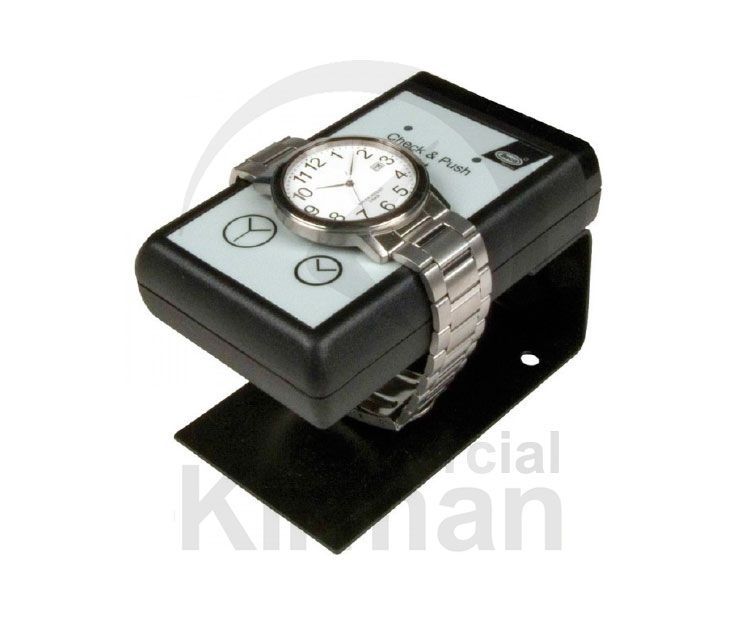 Comprobador plástico 038100 para movimientos de reloj, ideal para relojeros y entusiastas. Diseño compacto con soporte metálico plateado y pantalla frontal con indicadores. Permite verificar el funcionamiento de relojes de pulsera con precisión. Incluye reloj de demostración con correa metálica y esfera clara. Solución práctica para mantenimiento y