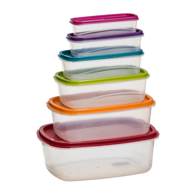 Conjunto de 6 fiambreras modelo Colors, ideales para conservar alimentos en la nevera o llevar comidas al trabajo o escuela. Fabricadas en plástico resistente y con tapas de colores llamativos (rojo, naranja, verde, azul, morado y rosa), permiten ver el contenido fácilmente. Perfectas para mantener los alimentos frescos y organizados.