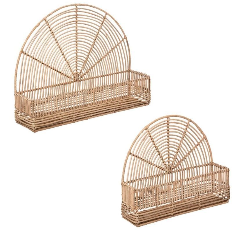 Conjunto de 2 estanterías de ratán con diseño semicircular, perfectas para decorar tu hogar con estilo natural. Hechas de ratán resistente y duradero, ideales para exponer libros, velas, plantas o accesorios. Dimensiones: 48x37 cm y 36x28 cm. Aportan un toque rústico y elegante a cualquier espacio.