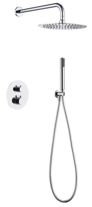 Conjunto de ducha termostático empotrado Monza en acabado cromo, con grifo de pared y ducha de lluvia circular. Incluye manguera flexible y ducha manual. Diseño moderno y minimalista, ideal para baños contemporáneos. Fabricado en acero inoxidable de alta calidad para mayor durabilidad y resistencia al óxido. Perfecto para quienes buscan funcionalid