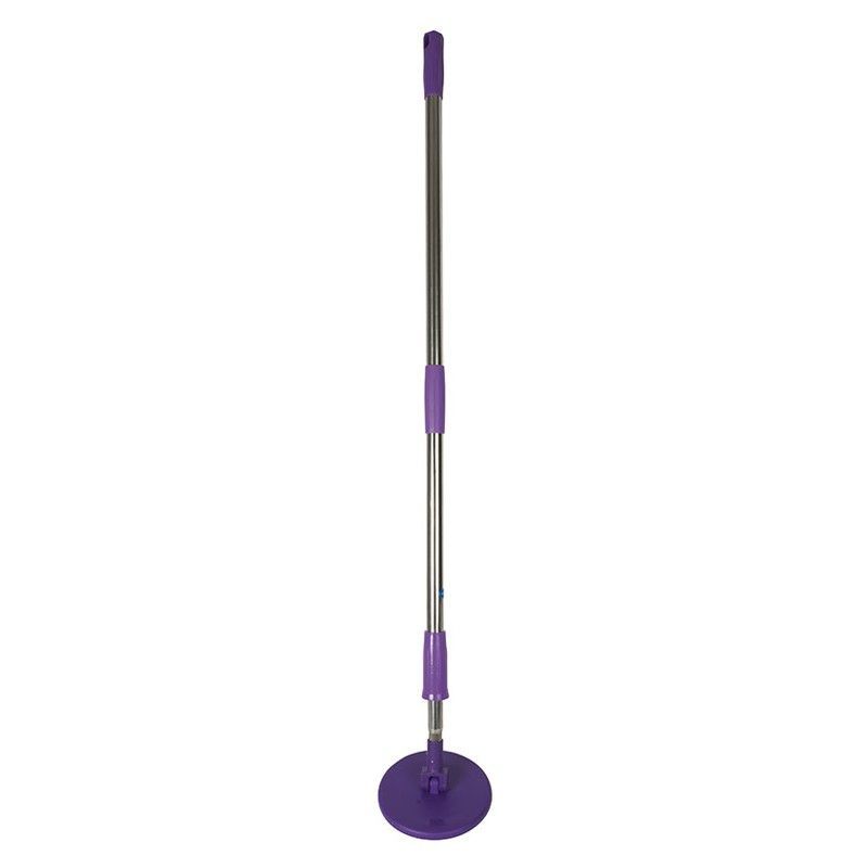 Conjunto de fregar DUETT en color morado, con palo telescópico de acero inoxidable y detalles en plástico. Ideal para limpiar suelos con comodidad y eficacia. Incluye palo recambio para mayor durabilidad. Diseño ergonómico con agarres antideslizantes y base circular para mayor estabilidad.