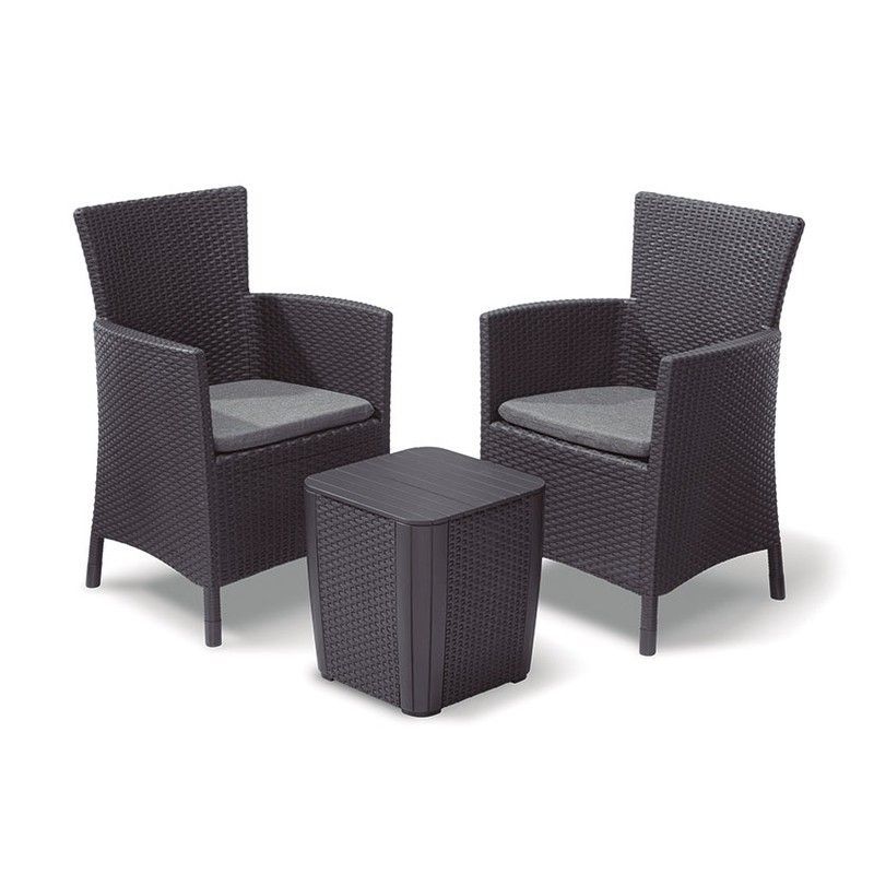 Conjunto KETER IOWA de mobiliario de exterior con gran confort, ideal para terrazas, balcones o jardines. Incluye dos sillones y una mesa auxiliar con estructura en mimbre sintético resistente y cojines acolchados en textil gris. Diseño moderno, fácil de limpiar y perfecto para disfrutar al aire libre con estilo y comodidad.