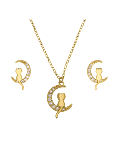Conjunto de joyería dorada para mujer con diseño de gato sentado sobre una media luna adornada con circonitas brillantes. Incluye collar con cadena fina y pendientes a juego. Ideal para amantes de los gatos que buscan un toque elegante y femenino en su look diario o para ocasiones especiales. Hecho en metal dorado de alta calidad, perfecto como reg