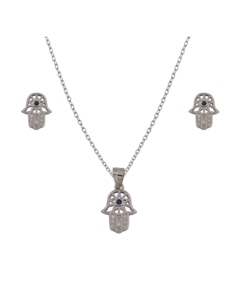 Conjunto de joyería para mujer en plata con diseño de Mano de Fátima, ideal para regalar o lucir en ocasiones especiales. Incluye colgante y pendientes con cristales brillantes y detalles en azul. Hecho en metal de alta calidad, perfecto para complementar tu look con elegancia y simbolismo protector.