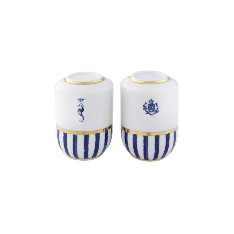 Conjunto de salero y pimentero de porcelana Transatlântica, ideal para decorar tu mesa con estilo náutico. Diseño elegante con rayas azules, detalles dorados y motivos marinos. Fabricado en porcelana de alta calidad, perfecto para uso diario o como regalo sofisticado. Aporta un toque clásico y marinero a tu cocina o comedor.