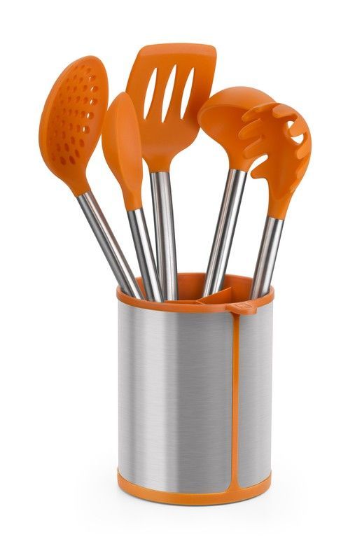 Conjunto de utensilios de cocina Efficient Bra con acabado naranja y plateado, fabricado en plástico resistente y acero inoxidable. Incluye espátula, cuchara perforada, cuchara para servir y pinzas, todos almacenados en un bote giratorio de acero inoxidable con detalles naranja. Ideal para mantener la cocina organizada y acceder fácilmente a los ut