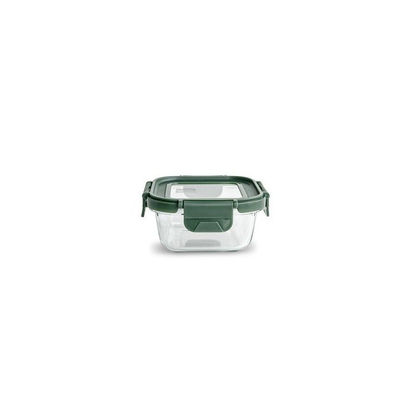 Contenedor cuadrado de vidrio de 320 ml con tapa de vidrio y cierre hermético en color verde. Ideal para conservar alimentos frescos en la nevera o calentarlos directamente en el horno. Resistente, seguro y fácil de limpiar. Perfecto para uso diario en cocina, comidas al aire libre o como fiambrera.