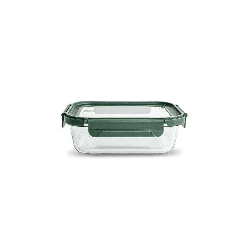 Contenedor rectangular de vidrio de 1040 ml con tapa de vidrio y bisagras verdes. Ideal para almacenar alimentos, llevar fiambras o cocinar en horno. Resistente, seguro y fácil de limpiar. Perfecto para uso diario en cocina y comedor.