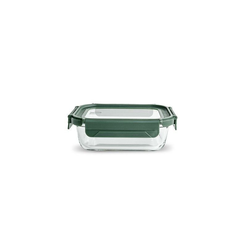 Contenedor rectangular de vidrio de 640 ml con tapa de vidrio y bisagras verdes. Ideal para conservar alimentos en la nevera o cocinar directamente en el horno. Resistente, seguro y fácil de limpiar. Perfecto para uso diario en cocina, comidas al aire libre o como fiambrera. Calidad duradera y diseño elegante.