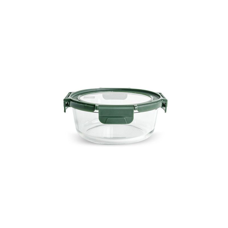 Contenedor redondo de vidrio de 950 ml con tapa de vidrio y cierre hermético en color verde. Ideal para almacenar alimentos, llevar fiambras o cocinar en horno. Resistente, seguro y fácil de limpiar. Perfecto para uso diario en cocina y comedor.