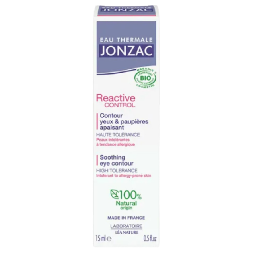 Contorno de ojos Reactive Control de Eau Thermale Jonzac, formulado para pieles intolerantes y con tendencia alérgica. Con 100% ingredientes de origen natural y certificación BIO, este producto apacigua y protege el contorno de ojos sensible. Ideal para pieles reactivas que buscan una solución suave y eficaz. Fabricado en Francia por Laboratoire Lé