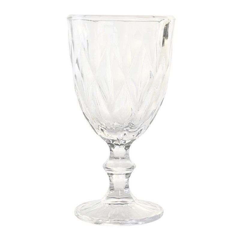 Copa de agua de cristal transparente, ideal para servir agua, vino o cócteles con estilo. Diseño elegante con tallado en forma de diamantes que refleja la luz, pie estrecho y base estable. Perfecta para uso diario o ocasiones especiales. Medidas: Ø 8,7 x 17 cm. Calidad duradera y fácil de lavar.