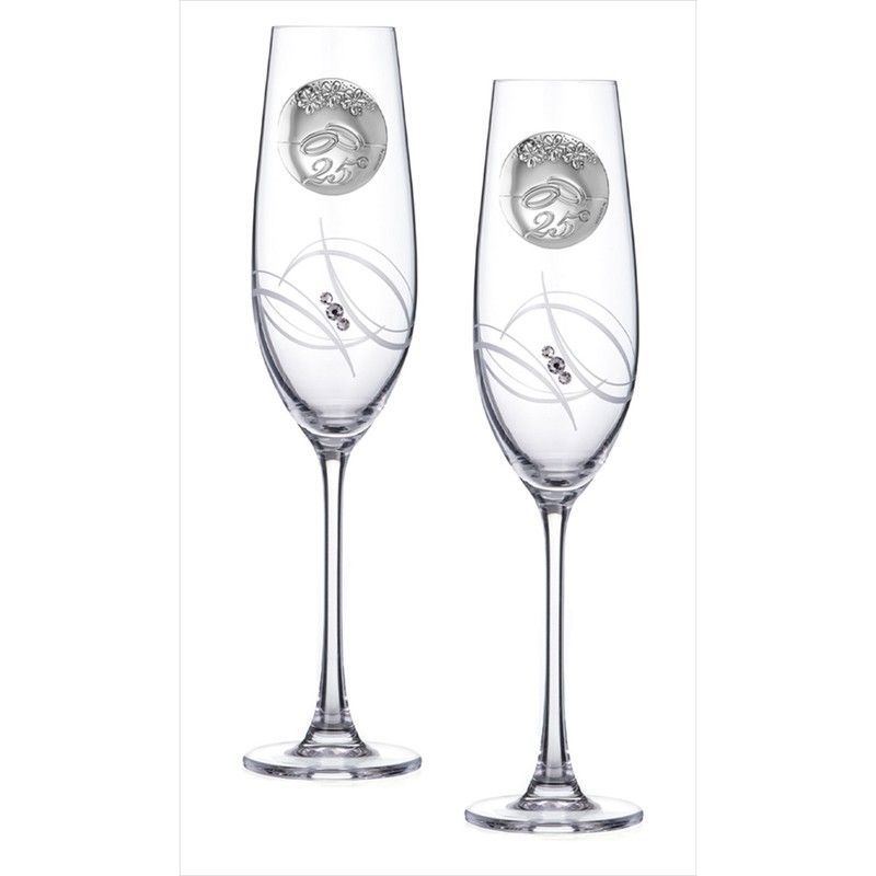 Copas conmemorativas de cristal para celebrar 25 años de matrimonio. Diseño elegante con anillos entrelazados y detalles plateados con cristales. Perfectas para brindar en bodas de plata. Calidad premium, ideales como regalo especial para parejas.