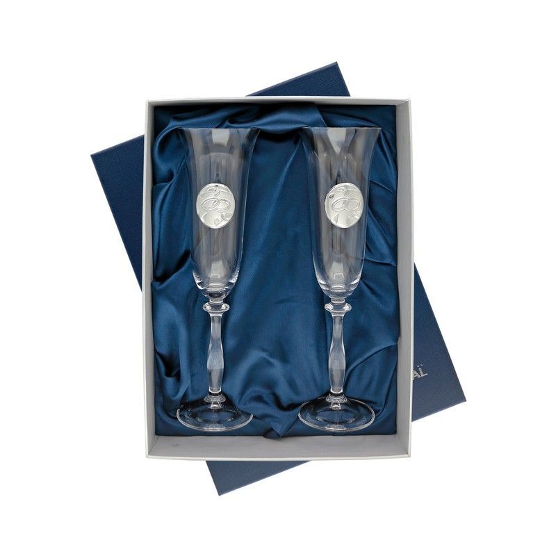Copas conmemorativas GA3116A de cristal con detalles metálicos plateados, ideales para celebraciones especiales. Cada copa presenta una medalla grabada en el cuerpo, combinando elegancia y significado. Incluyen caja de regalo con forro azul para un toque sofisticado. Perfectas como regalo para bodas, aniversarios o eventos memorables.