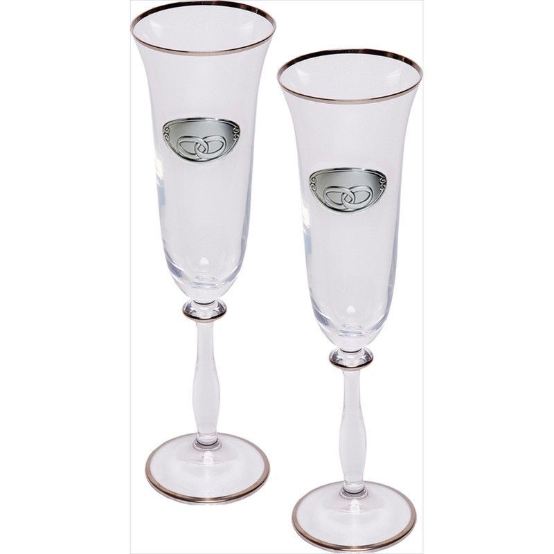 Copas conmemorativas GA4223A en cristal transparente con detalles plateados y borde dorado, ideales para celebraciones especiales como bodas. Diseño elegante con motivo de anillos entrelazados, perfectas como regalo para parejas. Fabricadas en cristal de alta calidad con acabados metálicos resistentes y duraderos.