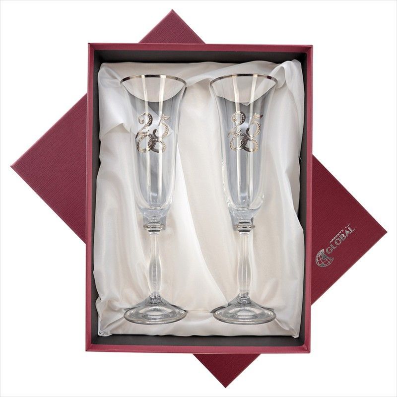 Copas conmemorativas de cristal para celebrar 25 años de matrimonio, con elegante diseño de anillos entrelazados en metal plateado. Ideales como regalo para bodas de plata, presentadas en caja de lujo con forro blanco. Calidad premium, perfectas para brindis especiales.