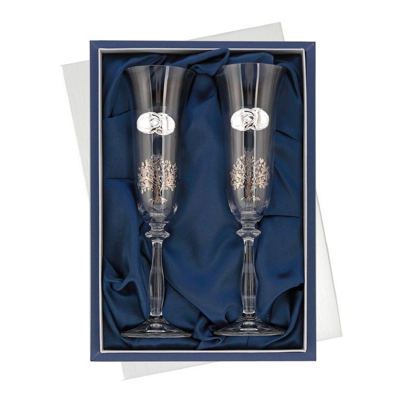 Copas conmemorativas GA4307A Árbol de la Vida con anillos, ideales para celebraciones especiales como bodas o aniversarios. Fabricadas en vidrio de alta calidad con detalles grabados en metal plateado, incluyen un elegante diseño de árbol de la vida y anillos entrelazados. Presentadas en una caja rectangular con forro de terciopelo azul, son un reg