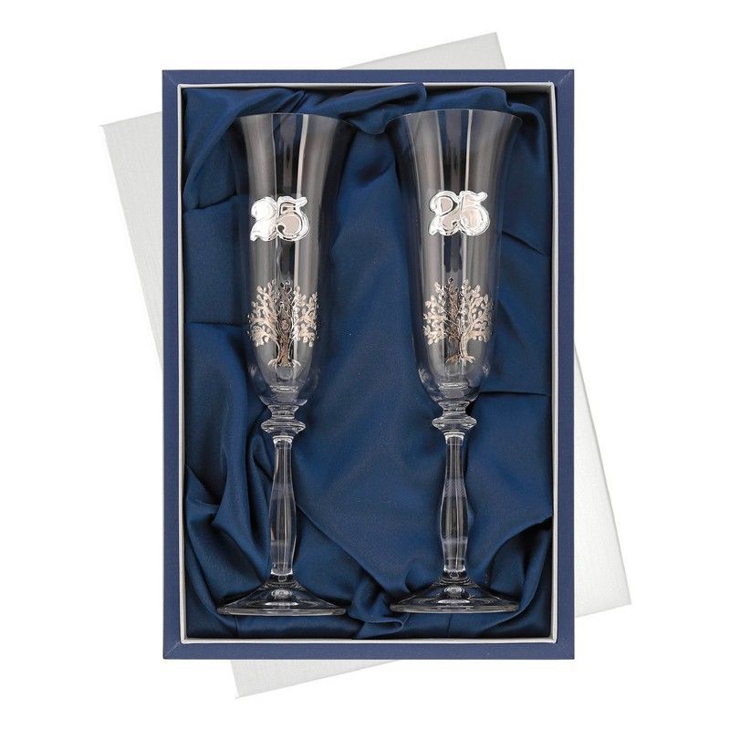 Copas conmemorativas GA4307V Árbol de la Vida 25 Años, elaboradas en vidrio transparente con detalles metálicos plateados. Diseño elegante con el número '25' y un árbol de la vida grabado, perfectas para celebrar bodas de plata. Incluyen caja de presentación con forro azul. Ideal como regalo para aniversarios especiales.