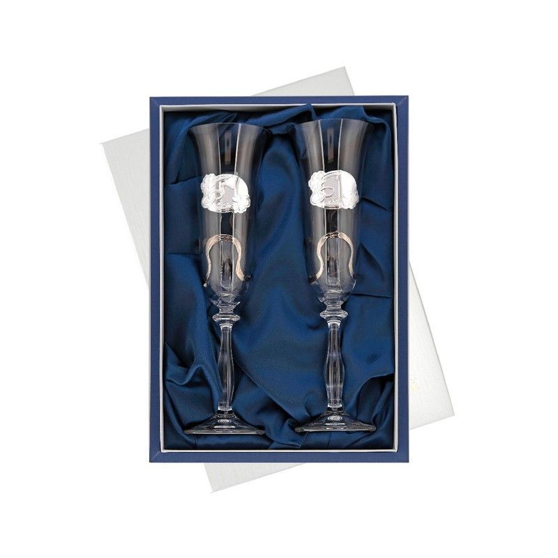 Copas conmemorativas GA4313A Alianzas, elaboradas en vidrio transparente con detalles metálicos plateados en forma de anillos entrelazados. Presentadas en una elegante caja con forro de terciopelo azul, son el regalo perfecto para bodas, aniversarios o celebraciones especiales. Diseño sofisticado y duradero, ideal para parejas que desean un recuerd