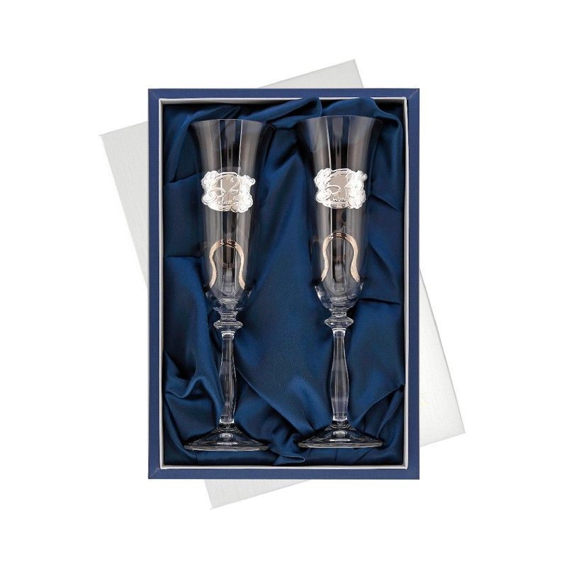 Copas conmemorativas GA4313V Alianzas 25 Años, elaboradas en vidrio transparente con detalles metálicos plateados en forma de anillos y motivos decorativos. Presentadas en una elegante caja con forro azul, ideales como regalo para celebrar el 25º aniversario de boda. Diseño sofisticado y duradero, perfecto para momentos especiales.