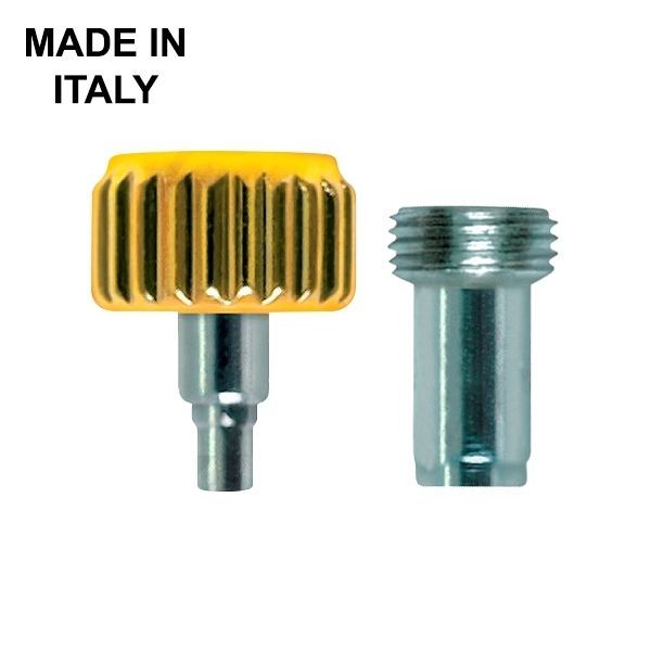 Corona reloj de acero inoxidable con acabado dorado y rosca, ideal para relojes mecánicos o de cuarzo. Diámetro exterior de 7,00 mm y tubo interno de 4,50 mm x 2,70 mm. Fabricada en Italia, ofrece precisión y durabilidad. Perfecta para relojeros y entusiastas del relojería que buscan piezas de calidad.
