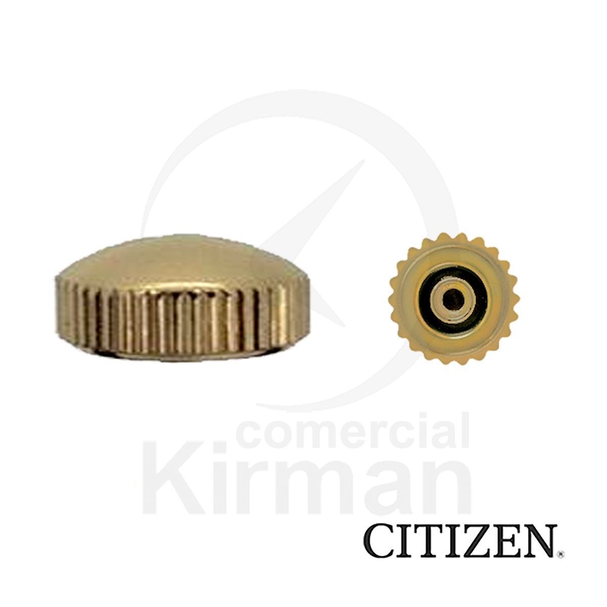 Corona de reloj Citizen en acero inoxidable con acabado dorado, ideal para relojes de pulsera. Diseño con ranuras verticales para un agarre seguro y bisel dentado con centro negro. Diámetro de 4,50 mm, compatible con tubo R90. Calidad profesional para relojeros y entusiastas del relojería.