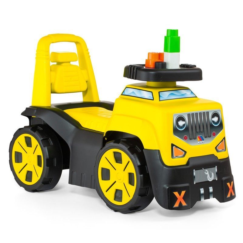 Correpasillos jeep amarillo para niños pequeños, fabricado en plástico resistente y seguro. Diseño divertido con ruedas grandes, asiento cómodo y detalles decorativos como faros y bloques de construcción en la parte superior. Ideal para el desarrollo motor y la diversión en casa o en el parque. Perfecto para niños en edad preescolar que comienzan a