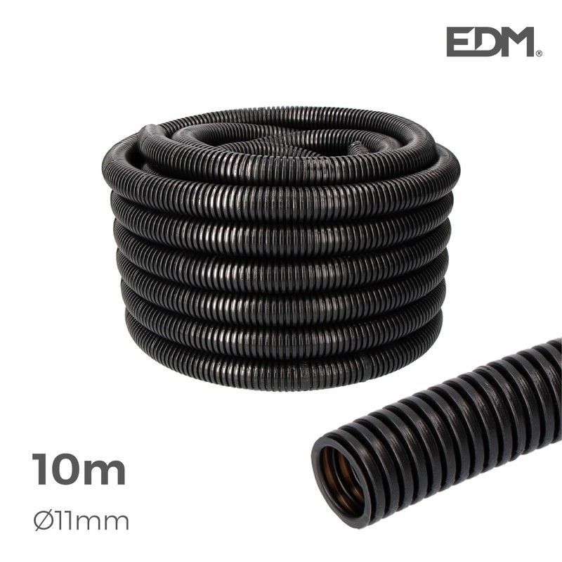 Tubo corrugado negro de 10 metros y 11 mm de diámetro, ideal para instalaciones eléctricas en interiores. Fabricado en plástico resistente, protege cables y conductores con facilidad de instalación. Perfecto para bricolaje y proyectos de ferretería en hogar y taller.
