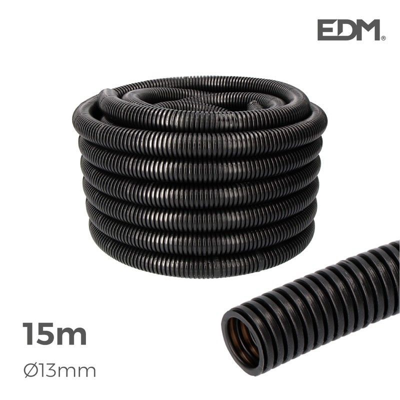 Tubo corrugado negro de 15 metros y 13 mm de diámetro, ideal para instalaciones interiores. Fabricado en plástico resistente, perfecto para canalización de cables, tuberías o como protección de conductos. Fácil de manipular y enrollar, adecuado para bricolaje y proyectos de ferretería.