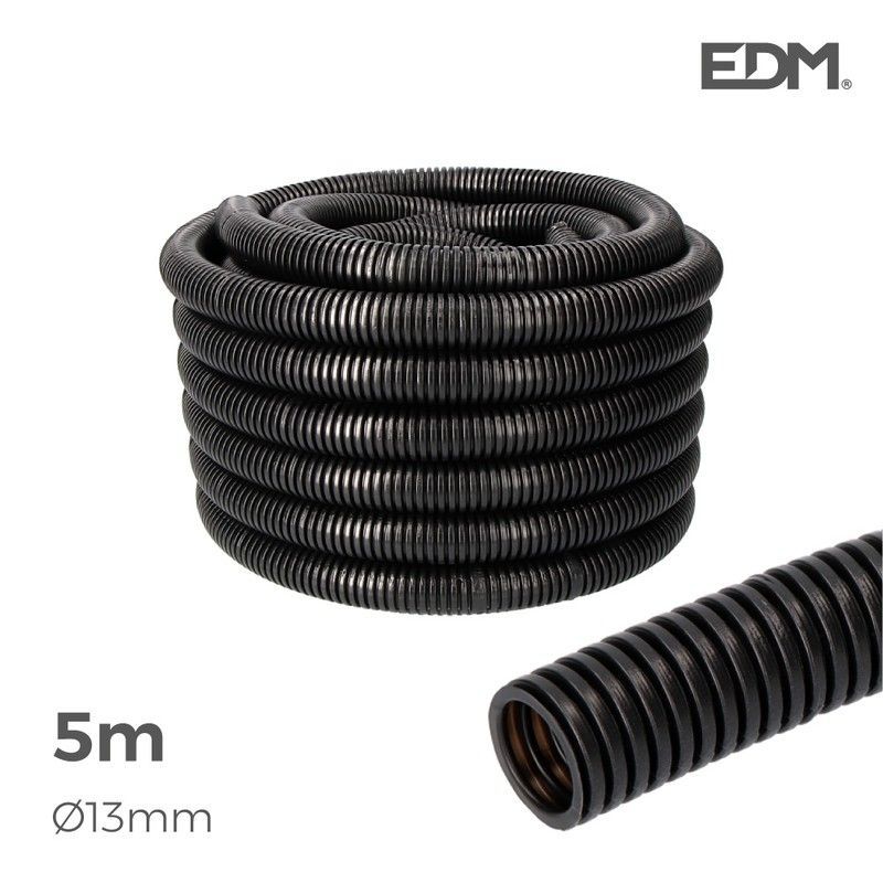 Tubo corrugado negro de 5 metros y 13 mm de diámetro, ideal para instalaciones interiores de fontanería, ventilación o conducción de cables. Fabricado en plástico resistente, flexible y duradero. Perfecto para bricolaje y proyectos de ferretería en hogar y taller.