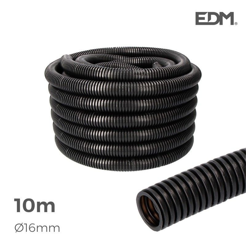 Tubo corrugado negro de 10 metros y 16 mm de diámetro, ideal para uso interior en instalaciones eléctricas o protección de cables. Fabricado en plástico resistente, ofrece flexibilidad y durabilidad. Perfecto para bricolaje, ferretería y proyectos de cableado doméstico o industrial.