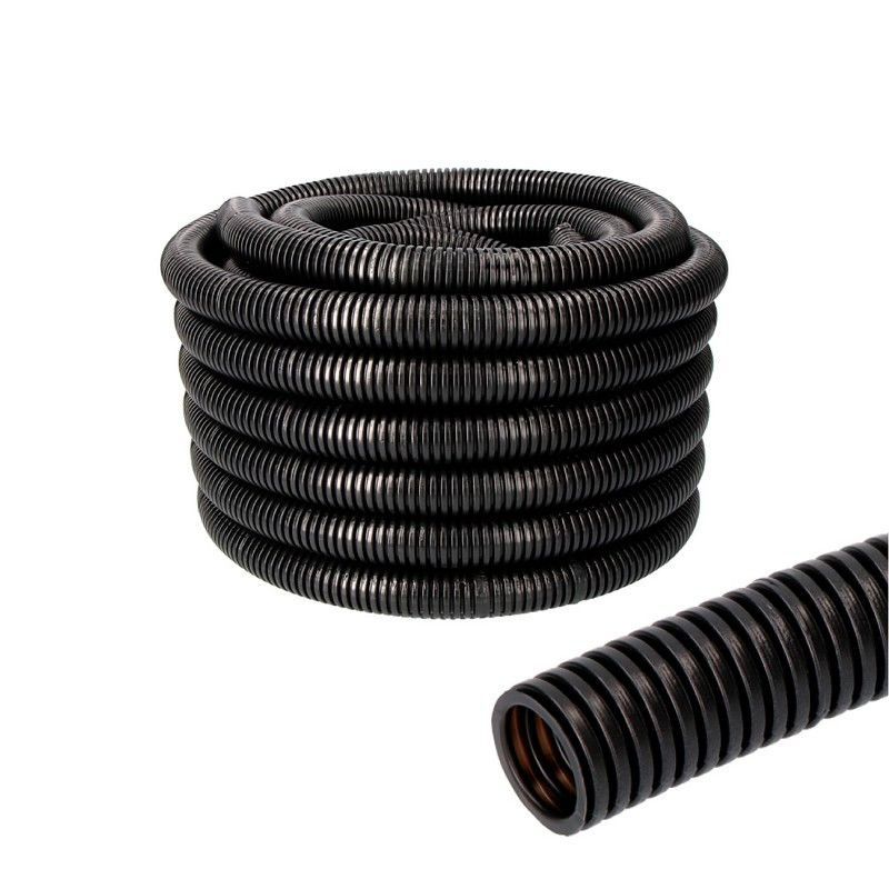 Tubo corrugado de plástico negro, ideal para instalaciones interiores. Medida 23 mm, longitud de 15 metros. Resistente y flexible, perfecto para canalización de cables, tuberías o ventilación. Fácil de instalar y manipular. Ideal para bricolaje y proyectos de ferretería.