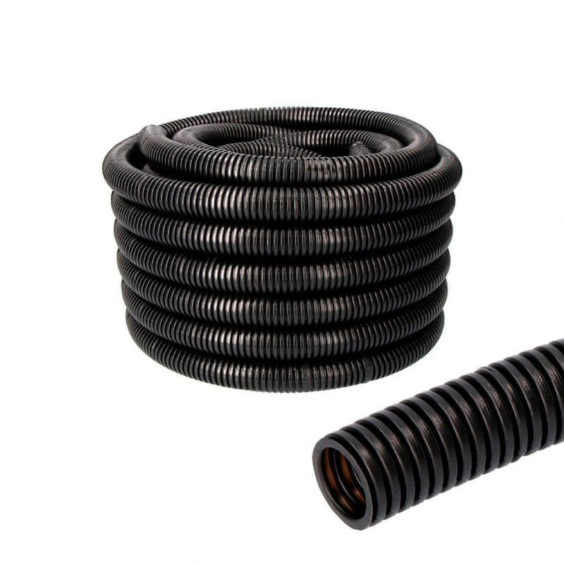 Tubo corrugado de plástico negro, ideal para instalaciones interiores. Medida 23 mm, longitud de 20 metros. Resistente y flexible, perfecto para canalización de cables, tuberías o ventilación. Fácil de instalar y adecuado para bricolaje y proyectos de ferretería.