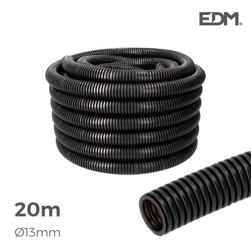 Tubo corrugado negro de 20 metros y 13 mm de diámetro, ideal para uso interior en bricolaje y ferretería. Fabricado en plástico resistente, perfecto para canalización de cables, tuberías o como protección de elementos en instalaciones. Fácil de enrollar y manejar, con diseño flexible y duradero.
