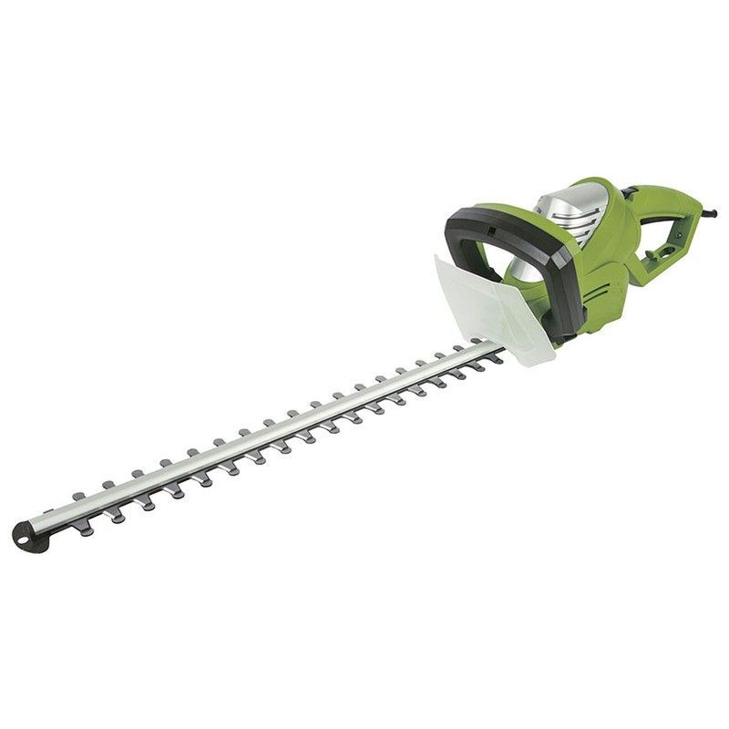 Cortasetos eléctrico LISTA CSE 710N con longitud de corte de 61 cm, ideal para mantener setos y arbustos en perfecto orden. Diseño ergonómico en verde y negro con barra de corte de acero inoxidable. Perfecto para jardines medianos y grandes, ofrece precisión y facilidad de uso. Ideal para jardineros y amantes del cuidado del hogar.