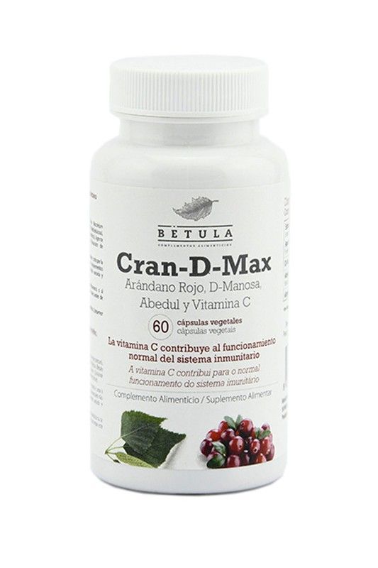 Cran-D-Max de Betula, un suplemento alimenticio en 60 cápsulas vegetales que combina arándano rojo, D-Manosa, abedul y vitamina C. Ideal para apoyar el funcionamiento normal del sistema inmunitario. Envasado en bote blanco con etiqueta clara y diseño natural, perfecto para adultos que buscan cuidar su salud de forma natural y efectiva.