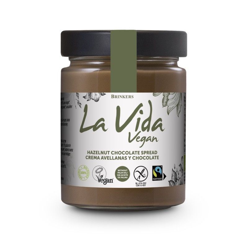 Bote de vidrio con tapa negraEtiqueta blanca con texto en verde y negroDiseño de hoja verde en los bordesLogotipos de certificación: vegano, sin gluten, fairtrade, ecológicoNombre del producto: la vida veganCrema de avellanas y chocolate