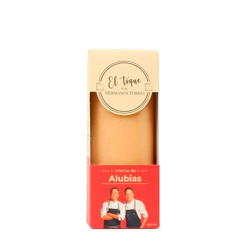 Crema de alubias de 435 ml de la marca El Toque de los Hermanos Torres, ideal para acompañar platos de carne, pescado o como base para guisos. Presentada en una caja rectangular con ventana transparente que muestra su textura cremosa y suave. Perfecta para cocinar con sabor auténtico y calidad garantizada.
