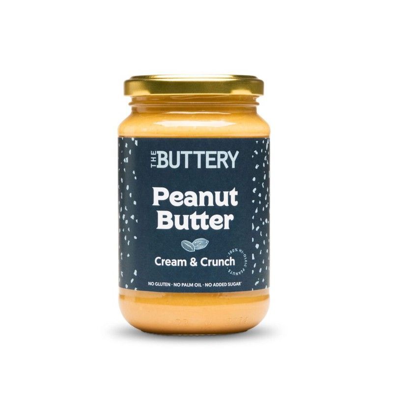 Crema de cacahuete crujiente de 350 g de The Buttery, ideal para desayunos, meriendas o repostería. Sin gluten, sin aceite de palma ni azúcar añadida. En bote de vidrio con tapa dorada y etiqueta elegante. Perfecta para amantes del sabor natural y textura cremosa con trocitos crujientes.