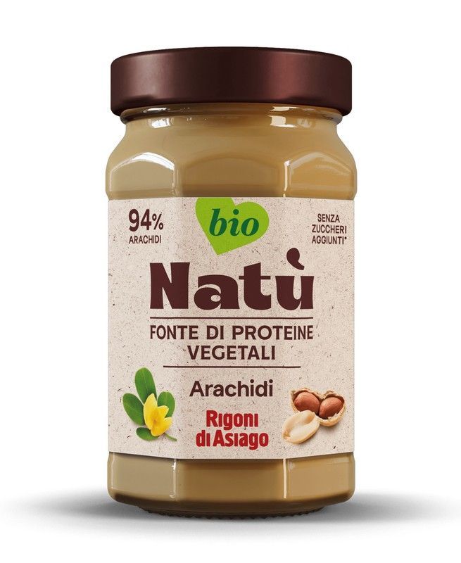 Crema de cacahuete Natù Bio de 220 grs, con 94% de cacahuetes y sin azúcares añadidos. Ideal para quienes buscan una fuente natural de proteínas vegetales. Envasada en bote de vidrio con tapa metálica, perfecta para untar en pan, tostadas o como snack saludable. Producto ecológico y sin aditivos.