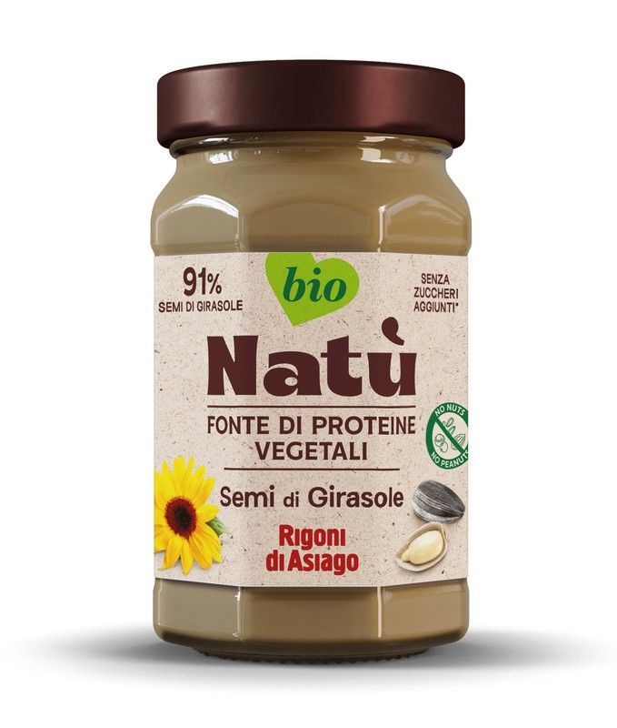 Crema de semillas de girasol Natù Bio, 220 grs, ideal para quienes buscan una fuente natural de proteínas vegetales. Con un 91% de semillas de girasol, sin azúcares añadidos ni nueces, es perfecta para dietas saludables y veganas. Envasada en bote de vidrio con tapa metálica, presenta un diseño rústico y natural que resalta su calidad orgánica. Ide