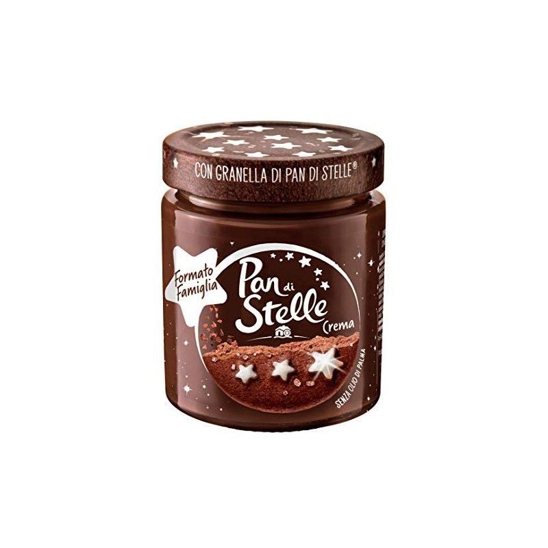 Crema untar Pan di Stelle de Mulino Bianco, formato familiar de 380g. Ideal para disfrutar en pan, tostadas o galletas. Con granos de pan di stelle, ofrece un sabor dulce y cremoso perfecto para toda la familia. Envase de vidrio con diseño festivo y estrellas blancas.