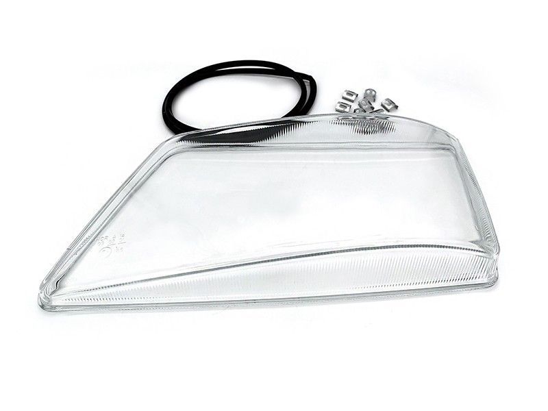 Cristal de faro izquierdo para vehículos Man Tg-X (-08), fabricado en plástico de alta calidad y resistente a los elementos. Diseño trapezoidal con bordes curvados y textura ondulada para una mejor difusión de luz. Incluye anillo de goma y tornillos de montaje. Ideal para reemplazo directo y mantenimiento de la iluminación del vehículo.